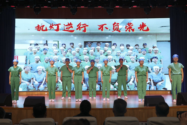 上篇在離退休黨總支帶來的伴奏大合唱《春風(fēng)十萬里》中緩緩開篇。老同志們飽含深情的歌聲,喚醒了幾代四院人的共同記憶。歌伴舞《最好的舞臺(tái)》活力四射,展現(xiàn)出青年職工的蓬勃朝氣;四重唱《光芒》以和聲傳遞溫暖,凝聚起團(tuán)隊(duì)的力量;歌伴舞《故鄉(xiāng)的云》動(dòng)人的歌聲和曼妙的舞姿,展現(xiàn)出我院教學(xué)創(chuàng)新與教師團(tuán)隊(duì)的銳意進(jìn)取;舞臺(tái)劇《光陰的故事》由乳腺中心全體醫(yī)護(hù)演繹,通過舞臺(tái)劇、朗誦、街舞、合唱等豐富多樣的形式,細(xì)膩還原了臨床一線的溫情瞬間,引得現(xiàn)場(chǎng)淚光與掌聲交織;京劇《詠梅》則以國粹之美,詮釋了醫(yī)者如梅的堅(jiān)韌風(fēng)骨。