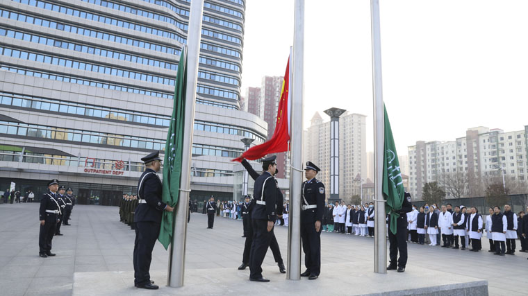 7點(diǎn)50分,隨著一聲響亮的口令,由醫(yī)院青年職工組成的國(guó)旗護(hù)衛(wèi)隊(duì)邁著鏗鏘有力、整齊劃一的步伐,護(hù)送著鮮艷的五星紅旗走向升旗臺(tái)。在雄壯激昂的國(guó)歌聲中,全體人員肅然而立,面向國(guó)旗行注目禮。