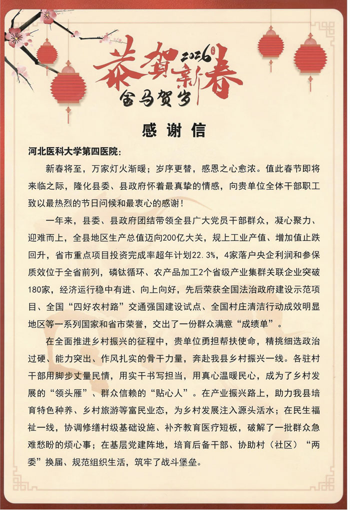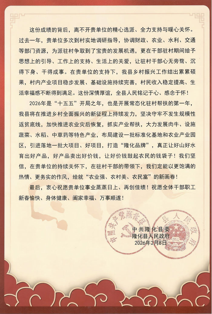2月13日,我院黨委收到來(lái)自中共隆化縣委隆化縣人民政府的一封感謝信,信中高度肯定我院駐村干部在產(chǎn)業(yè)振興、民生福祉、基層黨建等方面的突出貢獻(xiàn),提到駐村干部立足村情實(shí)際,用腳步丈量民情,用實(shí)干書(shū)寫(xiě)擔(dān)當(dāng),用真心溫暖民心,成為了鄉(xiāng)村發(fā)展的“領(lǐng)頭雁”、群眾信賴的“貼心人”。信中還指出,我院協(xié)調(diào)爭(zhēng)取的財(cái)政、農(nóng)業(yè)、水利、交通等多部門(mén)資源支持,為隆化縣鄉(xiāng)村振興注入了強(qiáng)勁動(dòng)能,推動(dòng)村級(jí)產(chǎn)業(yè)項(xiàng)目落地見(jiàn)效、基礎(chǔ)設(shè)施提檔升級(jí)、群眾增收渠道持續(xù)拓寬。
