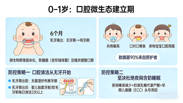 0–1歲:口腔微生態(tài)建立期,守住“致齲菌定植窗口期”
