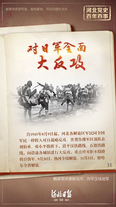 自1945年8月9日起,河北各解放區(qū)軍民同全國軍民一樣轉入對日戰(zhàn)略反攻。晉察冀軍區(qū)部隊在聶榮臻的指揮下,迅速將38個小團擴編為大團,將地方武裝編成62個團,使反攻的正規(guī)兵團擴大一倍。依據軍區(qū)統(tǒng)一部署,晉察冀各解放區(qū)部隊向日偽軍占領的城鎮(zhèn)全面發(fā)動進攻。晉冀魯豫軍區(qū)部隊在劉伯承、鄧小平指揮下,沿平漢鐵路線、石德鐵路線,向沿途各城鎮(zhèn)進行大反攻。1945年9月2日,日本政府在投降書上簽字,但被解放區(qū)部隊包圍的日偽軍拒不投降。河北軍民在保衛(wèi)勝利果實的同時,重點殲滅拒不投降的日偽軍。9月20日,熱河全境解放。11月3日,察哈爾全省解放。北平、天津、保定、石家莊、唐山等大中城市,分別處于河北各解放區(qū)包圍之中。