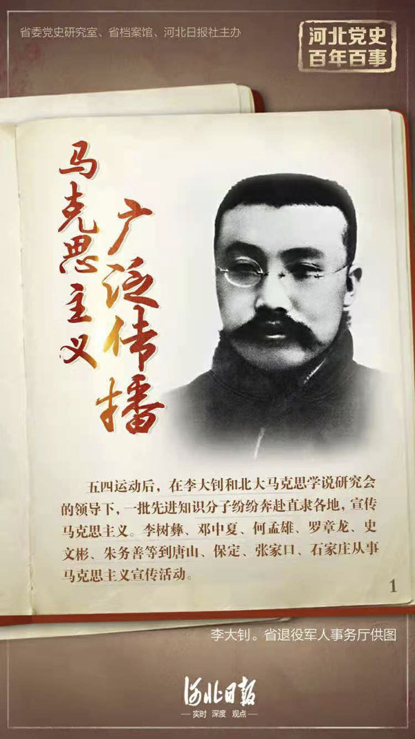 五四運動后,在李大釗和北大馬克思學說研究會的領(lǐng)導下,一批先進知識分子紛紛奔赴直隸各地,宣傳馬克思主義。李樹彝、鄧中夏、何孟雄、羅章龍、史文彬、朱務善等到唐山、保定、張家口、石家莊從事馬克思主義宣傳活動。