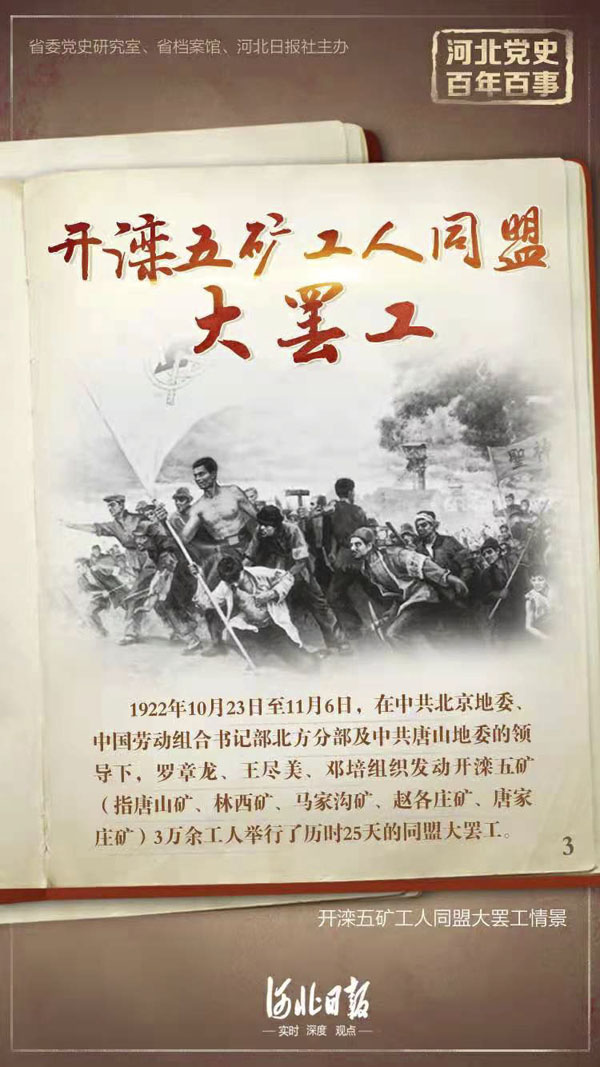 1922年10月23日,在中共北京地委、中國勞動組合書記部北方分部及中共唐山地委的領(lǐng)導(dǎo)下,羅章龍、王盡美、鄧培組織發(fā)動開灤五礦(指唐山礦、林西礦、馬家溝礦、趙各莊礦、唐家莊礦)3萬余工人舉行了歷時(shí)25天的同盟大罷工。此次罷工雖然在中外反動派的聯(lián)合鎮(zhèn)壓下沒有達(dá)到預(yù)期的目的,但在國內(nèi)外產(chǎn)生了重大的影響。