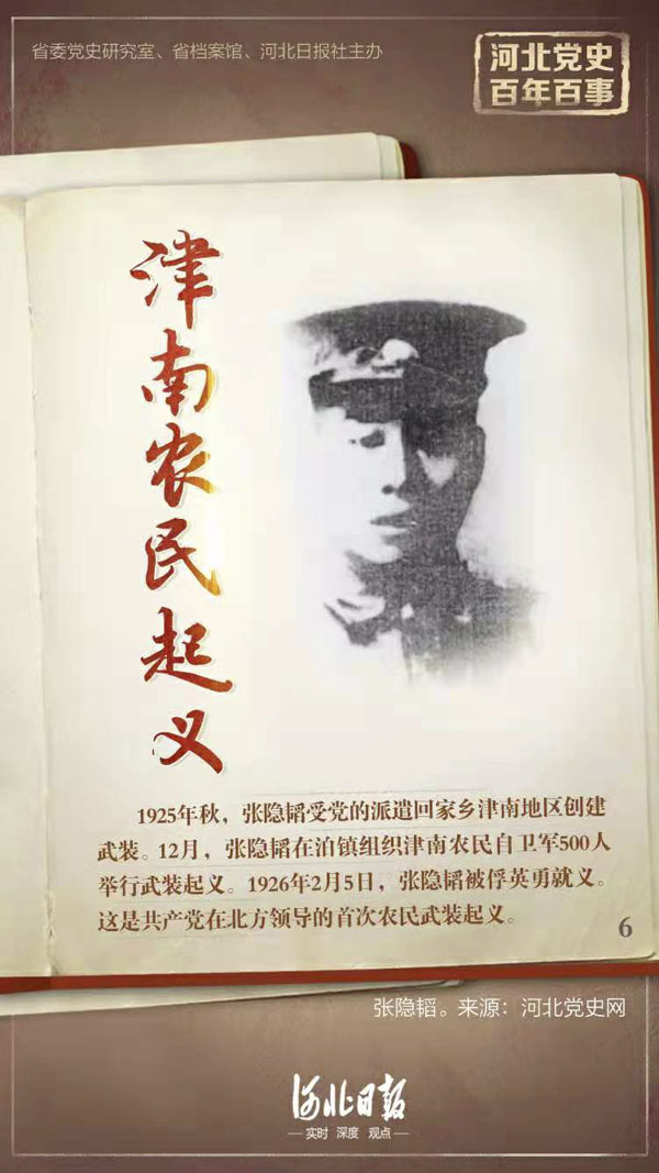 津南農(nóng)民起義是共產(chǎn)黨在北方領(lǐng)導的首次農(nóng)民武裝起義。1925年秋,張隱韜受黨的派遣以幫助國民軍攻打天津為由回家鄉(xiāng)津南地區(qū)創(chuàng)建武裝。12月,張隱韜在泊鎮(zhèn)組織津南農(nóng)民自衛(wèi)軍500人舉行武裝起義,宣布成立津南農(nóng)民自衛(wèi)軍,張隱韜任司令員兼黨代表。在“驅(qū)逐帝國主義,鏟除封建主義,實行共產(chǎn)主義”政治綱領(lǐng)的指導下,農(nóng)民自衛(wèi)軍先后攻占南皮、慶云等縣城,很快發(fā)展到1200多人,并發(fā)表《農(nóng)民自衛(wèi)軍宣言》,震動全國。在國民軍“排除異己”的鎮(zhèn)壓下,1926年2月5日,張隱韜被俘英勇就義,津南農(nóng)民起義失敗。