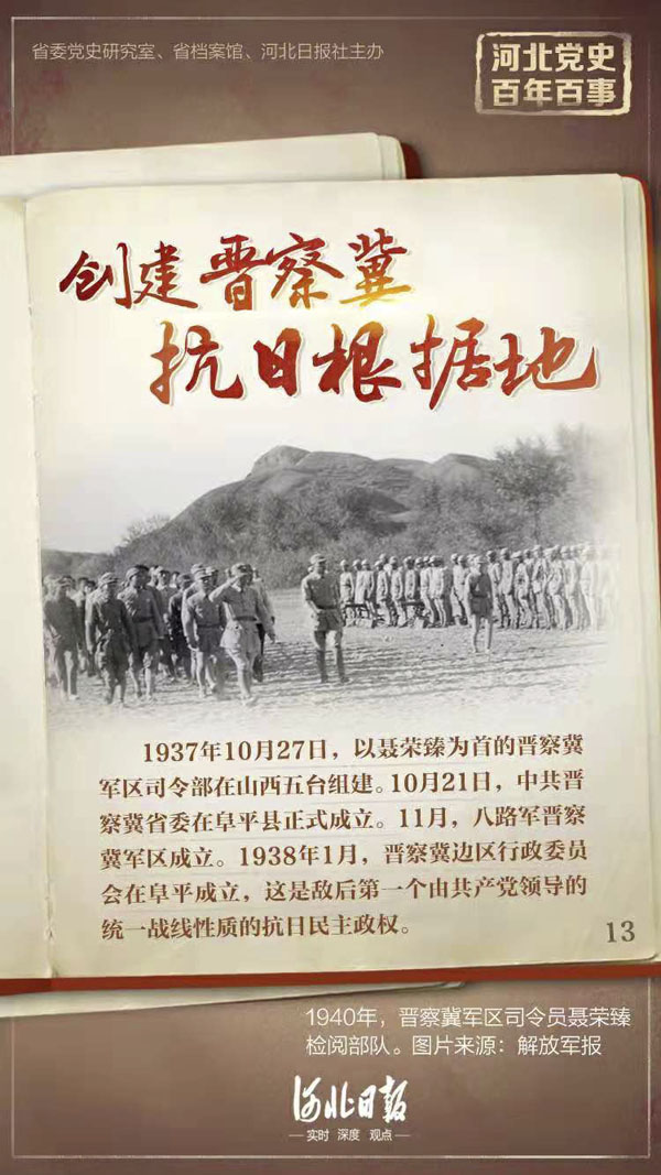 平型關(guān)戰(zhàn)役后,八路軍總部決定115師主力南下,留有該師政委聶榮臻率約3000人開始在晉、察、冀三省邊界開辟抗日根據(jù)地。1937年10月27日,以聶榮臻為首的晉察冀軍區(qū)司令部在山西五臺組建,在中共地方組織的配合下,分兵四路向察南、雁北、冀西等地發(fā)展。10月21日,中共晉察冀省委在阜平縣正式成立。11月,八路軍晉察冀軍區(qū)正式成立,下設四個軍分區(qū)。11月下旬,晉察冀省委在四個軍分區(qū)活動范圍內(nèi)分別組建四個特別區(qū)委。1938年1月,晉察冀邊區(qū)行政委員會在阜平成立,這是敵后第一個由共產(chǎn)黨領導的統(tǒng)一戰(zhàn)線性質(zhì)的抗日民主政權(quán)。至此,平漢、正太、同蒲、平綏鐵路之間的晉察冀邊區(qū)中心抗日根據(jù)地基本形成。