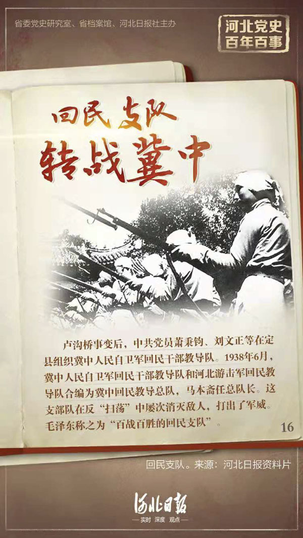 回民支隊是抗戰(zhàn)時期黨領(lǐng)導(dǎo)下發(fā)展起來的一支回民武裝。盧溝橋事變后,中共黨員蕭秉鈞、劉文正等在定縣組織冀中人民自衛(wèi)軍回民干部教導(dǎo)隊。回民馬本齋在獻縣組織回民義勇隊,并與馬仲三組織的回民武裝合編河北游擊軍回民教導(dǎo)隊。1938年6月,根據(jù)冀中軍區(qū)指示,冀中人民自衛(wèi)軍回民干部教導(dǎo)隊和河北游擊軍回民教導(dǎo)隊合編為冀中回民教導(dǎo)總隊,馬本齋任總隊長。1939年7月,冀中回民教導(dǎo)總隊改稱冀中軍區(qū)回民支隊,部隊發(fā)展到1000余人,馬本齋任司令員。