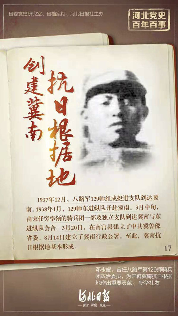 1937年12月,八路軍129師組成挺進支隊到達冀南,先后與駐隆平的冀南抗日游擊隊、直南臨時特委直接領導的冀南抗日聯(lián)軍會合。1938年1月,129師東進縱隊在司令員陳再道、政委李菁玉率領下,開赴冀南。3月中旬,由宋任窮率領的騎兵團一部及獨立支隊到達冀南與東進縱隊會合,確定了以南宮縣為中心向周圍發(fā)展創(chuàng)建根據(jù)地的方針。八路軍協(xié)同地方黨組織在冀南各地發(fā)動群眾,建立地方政權,改編各色武裝,組織抗日群眾團體。3月20日,在南宮縣建立了中共冀魯豫省委。同月,成立了統(tǒng)一戰(zhàn)線性質的冀南抗日軍政委員會,統(tǒng)一協(xié)調(diào)冀南各抗日武裝。8月14日建立了冀南行政公署。至此,西起平漢路,東至津浦路,北至滄石路,南越漳河、衛(wèi)河的冀南抗日根據(jù)地基本形成。