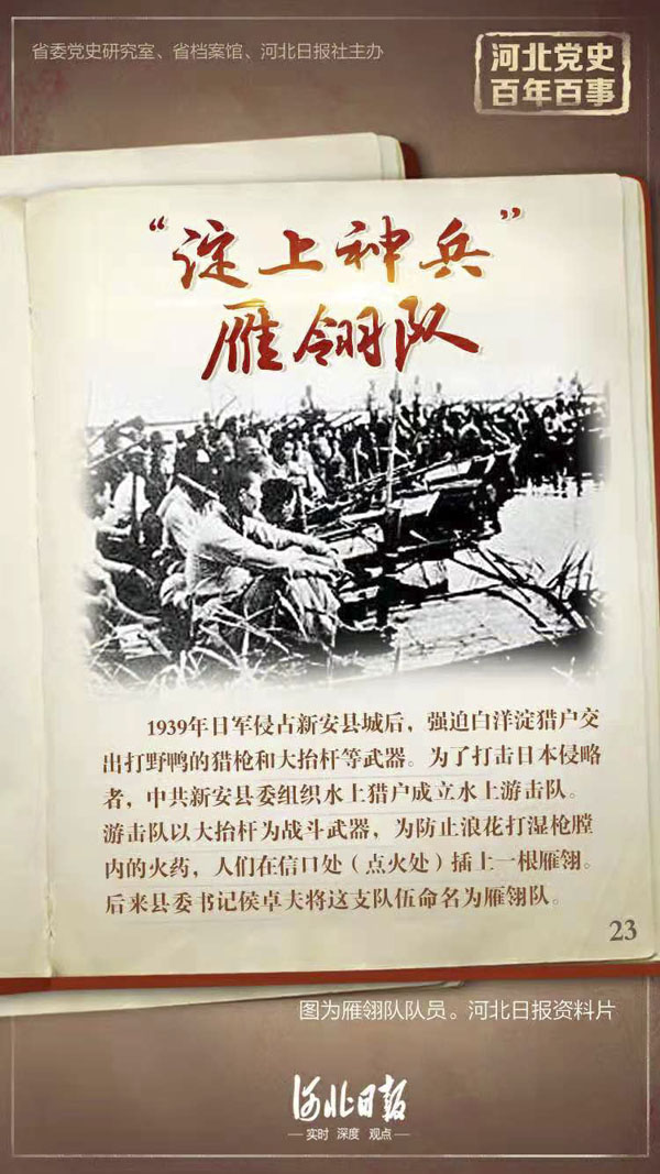 活躍于冀中白洋淀地區(qū)的水上游擊隊。1939年日軍侵占新安縣城后,強迫白洋淀獵戶交出打野鴨的獵槍和大抬桿等武器。為了打擊日本侵略者,中共新安縣委組織水上獵戶成立水上游擊隊。游擊隊以大抬桿為戰(zhàn)斗武器,為防止浪花打濕槍膛內(nèi)的火藥,人們在信口處(點火處)插上一根雁翎。后來縣委書記侯卓夫?qū)⑦@支隊伍命名為雁翎隊。從此,雁翎隊的名字響徹冀中平原。雁翎隊活躍在白洋淀的蘆葦蕩里,神出鬼沒地打擊日軍過往的船只,襲擊“掃蕩”的日軍,打擊漢奸、偽軍,在中國抗日戰(zhàn)爭史上留下了光輝的一頁。