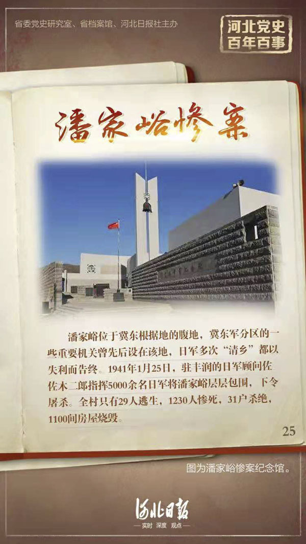 潘家峪位于冀東根據(jù)地的腹地,冀東軍分區(qū)的一些重要機(jī)關(guān)曾先后設(shè)在該地,日軍多次“清鄉(xiāng)”都以失利而告終。1941年1月25日,在唐山日軍守備隊(duì)的指示下,駐豐潤的日軍顧問佐佐木二郎指揮5000余名日軍將潘家峪層層包圍,把全村群眾驅(qū)趕到村西大坑,在詢問八路軍去向無果的情況下,又將群眾驅(qū)趕到地主潘惠林的宅院。群眾發(fā)現(xiàn)院內(nèi)布滿柴草,四周架著機(jī)槍,掉頭沖向大門口。佐佐木二郎下令屠殺,當(dāng)即日軍的機(jī)槍、步槍一齊開火,并引燃柴草。手無寸鐵的群眾雖作殊死搏斗,但最終只有29人逃生。此次屠殺致全村1230人慘死,31戶殺絕,1100間房屋燒毀。為了向日軍討還血債,1941年3月,潘家峪幸存者組成“潘家峪復(fù)仇團(tuán)”,投身抗日戰(zhàn)爭洪流之中。