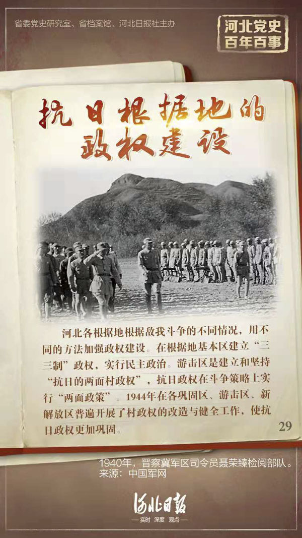 河北各根據(jù)地根據(jù)敵我斗爭的不同情況,用不同的方法加強政權建設。在根據(jù)地基本區(qū)建立“三三制”政權,實行民主政治。這種政策規(guī)定在政權工作人員中,共產黨員、非黨的左派進步分子和中間派應各占1/3。通過開展民主選舉運動,使河北各根據(jù)地的各級政權實現(xiàn)了“三三制”原則。游擊區(qū)是建立和堅持“抗日的兩面村政權”,抗日政權在斗爭策略上實行“兩面政策”。1944年在各鞏固區(qū)、游擊區(qū)、新解放區(qū)普遍開展了村政權的改造與健全工作,使抗日政權更加鞏固。根據(jù)中共中央的指示,河北各根據(jù)地從1942年開始精兵簡政。不斷加強政權建設,對鞏固和發(fā)展根據(jù)地起了重要作用。