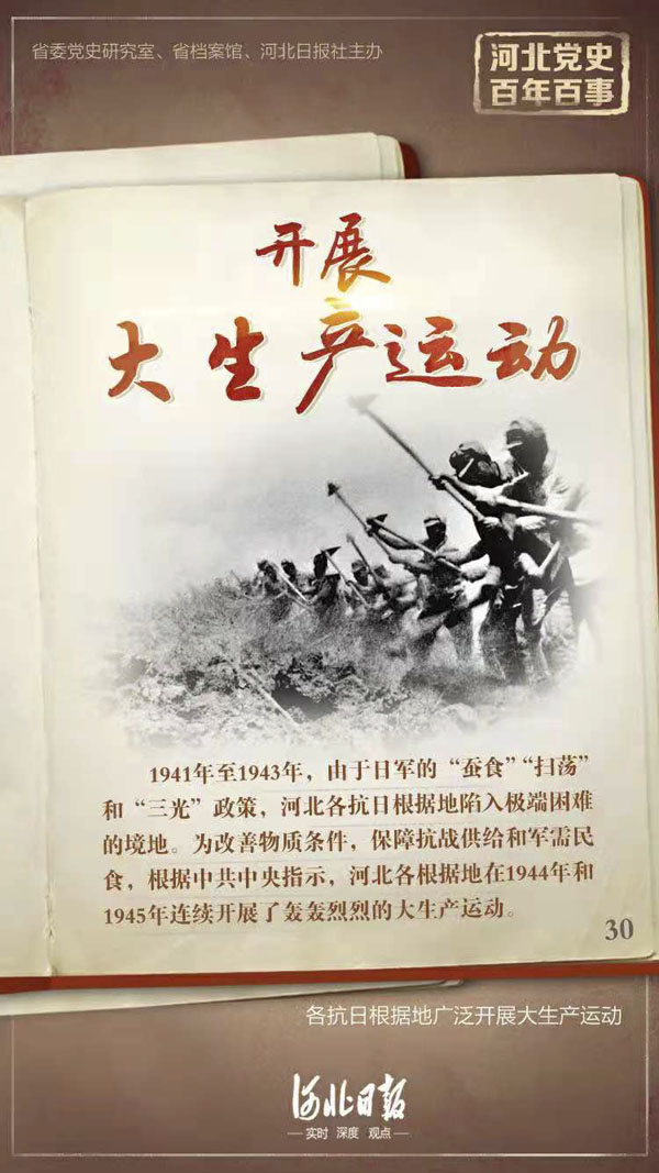1941年至1943年,由于日軍的“蠶食”“掃蕩”和“三光”政策,河北各抗日根據(jù)地陷入極端困難的境地。為改善物質(zhì)條件,保障抗戰(zhàn)供給和軍需民食,根據(jù)中共中央指示,河北各根據(jù)地在1944年和1945年連續(xù)開(kāi)展了轟轟烈烈的大生產(chǎn)運(yùn)動(dòng)。各根據(jù)地建立了大生產(chǎn)運(yùn)動(dòng)領(lǐng)導(dǎo)機(jī)構(gòu),廣泛發(fā)動(dòng)群眾,組織撥工組、互助組、復(fù)工隊(duì),進(jìn)行開(kāi)荒、平溝、開(kāi)渠造井,擴(kuò)大耕地面積和可澆地面積。在災(zāi)區(qū),以開(kāi)展生產(chǎn)自救為中心,組織農(nóng)副業(yè)、運(yùn)輸業(yè)相結(jié)合的勞動(dòng)互助。部隊(duì)也在戰(zhàn)斗間隙進(jìn)行生產(chǎn)。為了指導(dǎo)改進(jìn)農(nóng)業(yè)技術(shù),各地還成立了農(nóng)業(yè)指導(dǎo)所,培訓(xùn)干部,組織勞動(dòng)競(jìng)賽,建立試驗(yàn)組等。同時(shí)還組織起紡織、榨油、造紙、農(nóng)具、醫(yī)藥、煤炭、熬鹽等各種生產(chǎn)合作社,并發(fā)展了軍需工業(yè)。