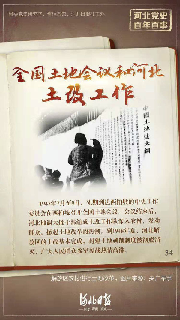 人民解放軍轉(zhuǎn)入戰(zhàn)略反攻之后,為充分調(diào)動人民群眾革命和生產(chǎn)的積極性,徹底改革農(nóng)村土地制度,1947年7月至9月,先期到達(dá)西柏坡的中央工作委員會在西柏坡召開全國土地會議。會議總結(jié)了一年來土改工作的經(jīng)驗,通過了《中國土地法大綱》,明確規(guī)定:廢除封建及半封建剝削的土地制度,實行耕者有其田的土地制度和分配土地的政策。會議結(jié)束后,河北抽調(diào)大批干部組成土改工作隊深入農(nóng)村,發(fā)動群眾,掀起土地改革的熱潮。在河北的土改中,針對不同地區(qū)采取不同政策。土改進(jìn)行徹底的地區(qū)進(jìn)行檢查調(diào)整;不太徹底的地區(qū)實行徹底的土改,進(jìn)行大范圍的抽調(diào)調(diào)劑;未實行土改的地區(qū)實行平分土地。在少數(shù)民族地區(qū)則貫徹執(zhí)行民族政策。到1948年夏,河北解放區(qū)的土改基本完成,封建土地剝削制度被徹底消滅,廣大人民群眾參軍參戰(zhàn)熱情高漲。