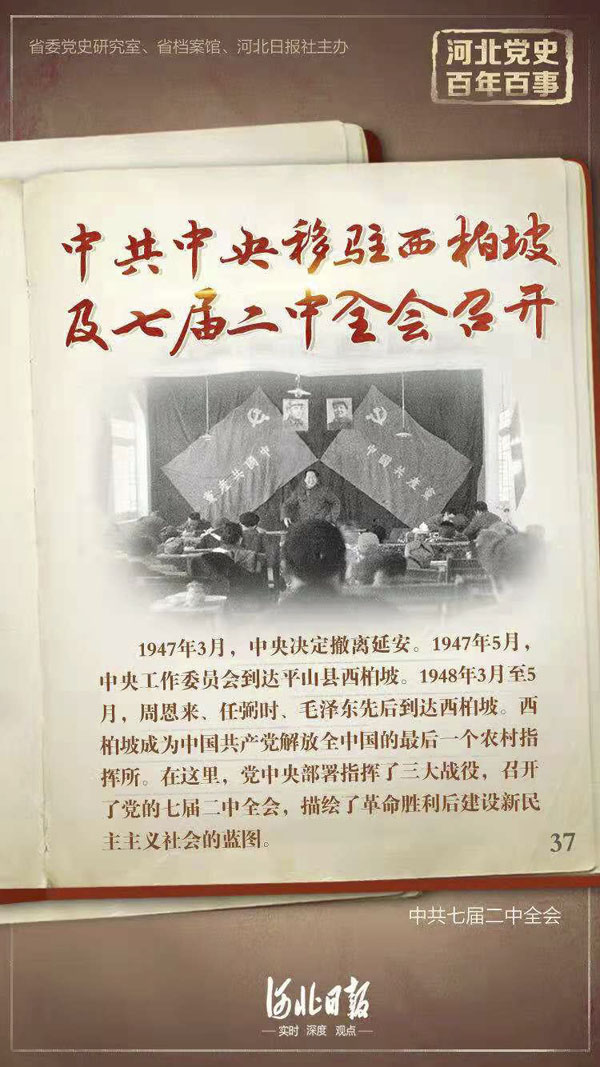 1947年3月,國(guó)民黨重兵進(jìn)攻延安,中央決定暫時(shí)撤離延安。此后,由毛澤東、周恩來(lái)、任弼時(shí)率中央機(jī)關(guān)和解放軍總部轉(zhuǎn)戰(zhàn)陜北。由劉少奇、朱德、董必武組成的中央工作委員會(huì)轉(zhuǎn)移到晉察冀。由葉劍英、楊尚昆組成中央后方委員會(huì)。1947年5月,中央工作委員會(huì)到達(dá)地理位置優(yōu)越、群眾基礎(chǔ)好的平山縣西柏坡。1948年3月,中央后方委員會(huì)也到達(dá)西柏坡。1948年4月,周恩來(lái)、任弼時(shí)到達(dá)西柏坡,與中央工委會(huì)合,5月27日,毛澤東從阜平到達(dá)西柏坡。西柏坡成為中國(guó)共產(chǎn)黨解放全中國(guó)的最后一個(gè)農(nóng)村指揮所。在這里,黨中央制定一系列重大的戰(zhàn)略決策和政策,部署指揮了震驚世界、改變中國(guó)命運(yùn)的三大戰(zhàn)役,召開(kāi)了黨的七屆二中全會(huì),描繪了革命勝利后建設(shè)新民主主義社會(huì)的藍(lán)圖,對(duì)迎接革命勝利和新中國(guó)建設(shè)具有重大指導(dǎo)作用。