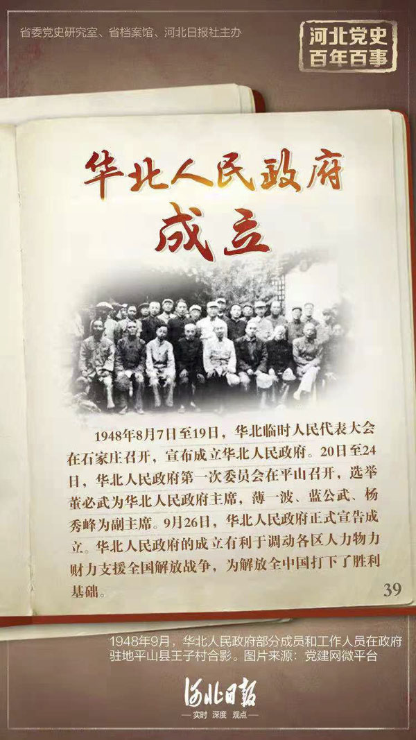 華北中央局和華北政府的成立使晉察冀和晉冀魯豫兩邊區(qū)政府合并成為了必然,按照中央指示,兩區(qū)行政委員會同時遷到河北石家莊辦公,成立了聯(lián)合行政委員會。1948年6月26日,兩邊區(qū)參議會駐會議員在石家莊舉行聯(lián)席會議,通過了迅速召開華北臨時人民代表大會,產(chǎn)生華北統(tǒng)一政府的決議。8月7日至19日,華北臨時人民代表大會在石家莊召開,宣布成立華北人民政府。20日至24日,華北人民政府第一次委員會在平山召開,選舉董必武為華北人民政府主席,薄一波、藍公武、楊秀峰為副主席。會議還進一步明確政府施政方針及軍事、經(jīng)濟、政治、文化教育核心區(qū)各項政策。9月26日,華北人民政府正式宣告成立。華北人民政府的成立為恢復和發(fā)展華北經(jīng)濟創(chuàng)造了條件,為民主政權建設積累了經(jīng)驗,也使華北的黨政軍領導實現(xiàn)了統(tǒng)一,有利于調(diào)動各區(qū)人力物力財力支援全國解放戰(zhàn)爭,為解放全中國打下了勝利基礎。
