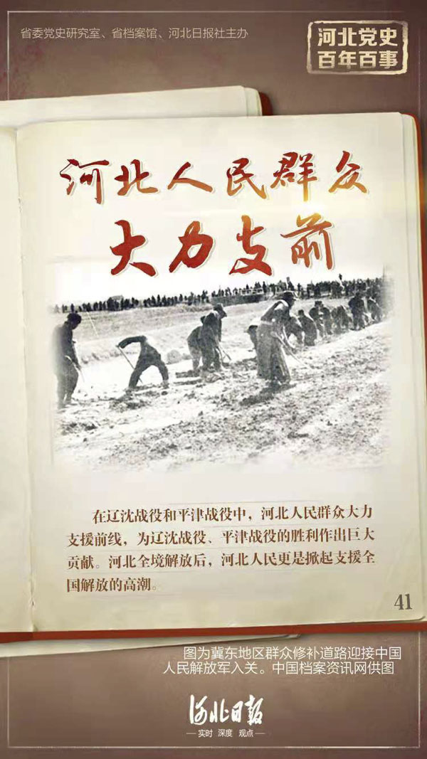 在遼沈戰(zhàn)役前夕,冀察熱遼中央分局發(fā)出《關(guān)于一切為了解放戰(zhàn)爭的勝利的指示》,號(hào)召黨政軍民大力支援前線。據(jù)不完全統(tǒng)計(jì),熱河省共組織擔(dān)架1.1萬副,運(yùn)輸車輛5000余輛。在遼沈戰(zhàn)役中,冀東區(qū)以“傾家蕩產(chǎn)”的精神全力支援。全區(qū)建立健全各級(jí)戰(zhàn)勤組織機(jī)構(gòu),先后動(dòng)員了15萬人、3萬副擔(dān)架、1萬輛大車開赴前線支前。冀中區(qū)動(dòng)員15萬人、3萬余副擔(dān)架、1萬輛大車支援遼沈戰(zhàn)役。在平津戰(zhàn)役中,河北軍民在“一切為了前線”號(hào)召下,更是掀起支前熱潮,各級(jí)黨政機(jī)關(guān)都建立支前機(jī)構(gòu),北岳、冀中區(qū)在平津周圍建立5個(gè)指揮部,協(xié)調(diào)組織支前工作。全省搶修鐵路、公路3900余公里,籌集糧草7億多公斤,豬肉、雞蛋等慰問品難以計(jì)數(shù)。冀中區(qū)組織了4.4萬人的破冰隊(duì),砸開了白洋淀和大清河上的冰,使糧草船可從水路直達(dá)前線。冀東區(qū)動(dòng)員民工200萬人次,組織了30萬群眾參加擔(dān)架團(tuán),籌集軍糧2.64億斤,軍鞋100萬雙。據(jù)察哈爾、冀東、冀中不完全統(tǒng)計(jì),動(dòng)員民兵、民工260余萬人,擔(dān)架2.3萬余副,大車61萬輛。河北人民為遼沈戰(zhàn)役、平津戰(zhàn)役的勝利作出巨大貢獻(xiàn)。河北全境解放后,河北人民更是掀起支援全國解放的高潮。