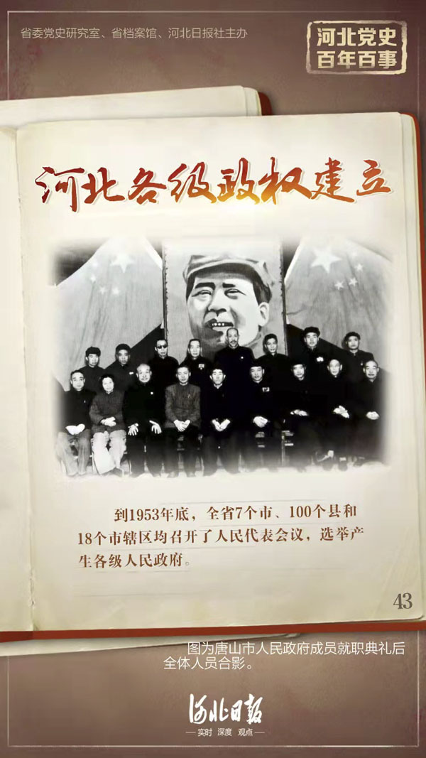 1949年7月,中共河北省委在第一次全會(huì)上,提出了加強(qiáng)地方政權(quán)建設(shè)的措施,確定在兩三年內(nèi)普遍舉行各級(jí)人民代表大會(huì),選舉省市縣村各級(jí)人民政府。省委省政府成立以后,迅速鎮(zhèn)壓反動(dòng)派,肅清反動(dòng)殘余。同時(shí),各級(jí)黨組織領(lǐng)導(dǎo)開(kāi)展群眾性民主建政運(yùn)動(dòng)。農(nóng)村黨組織和黨員也公開(kāi)帶領(lǐng)農(nóng)民群眾建立農(nóng)會(huì),組織基層政權(quán)。1950年2月,省政府要求在谷雨前后普遍召開(kāi)村區(qū)縣三級(jí)人民代表會(huì)議。在此基礎(chǔ)上,1950年11月1日,河北省首屆各界人民代表會(huì)議在省會(huì)保定召開(kāi)。會(huì)議代行人民代表大會(huì)職權(quán),選舉產(chǎn)生了新的河北省人民政府。到1953年底,全省7個(gè)市、100個(gè)縣和18個(gè)市轄區(qū)均召開(kāi)了人民代表會(huì)議,代行人民代表大會(huì)職權(quán),選舉產(chǎn)生各級(jí)人民政府。人民政權(quán)制度自上而下迅速建立起來(lái)。河北省各級(jí)人民政權(quán)的建立,標(biāo)志著新民主主義革命在全省取得徹底的勝利,為新民主主義建設(shè)奠定了堅(jiān)實(shí)的基礎(chǔ)。