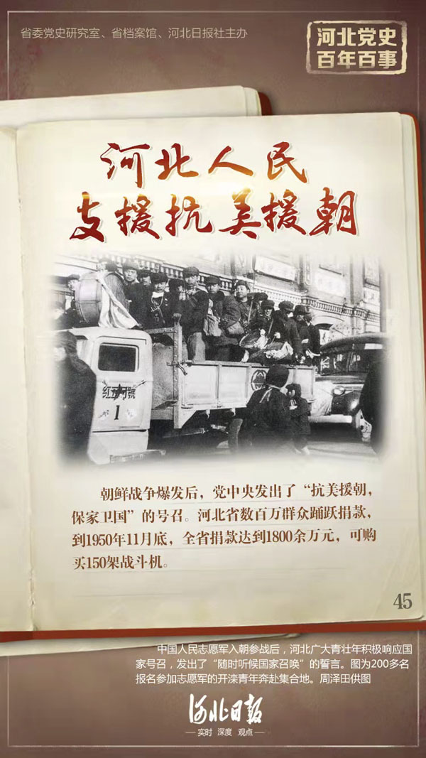 朝鮮戰(zhàn)爭爆發(fā)后,黨中央發(fā)出了“抗美援朝,保家衛(wèi)國”的號召。1950年11月,河北省委發(fā)出指示,要求全省各級黨委把抗美援朝作為政治任務(wù)廣泛深入宣傳。全省人民迅速掀起了參軍參戰(zhàn)、捐款捐物、積極生產(chǎn)的熱潮,以實際行動支援抗美援朝。同時,全省人民廣泛訂立以增產(chǎn)節(jié)約為主要內(nèi)容的《愛國公約》,人民群眾愛國生產(chǎn)熱情空前高漲。廣大工人努力工作,產(chǎn)量成倍提高。廣大農(nóng)民努力生產(chǎn),積極交納愛國糧棉。全省數(shù)百萬群眾踴躍捐款,到11月底,全省捐款達到1800余萬元,可購買150架戰(zhàn)斗機。轟轟烈烈的抗美援朝運動,大大提高了全省人民愛國熱情、生產(chǎn)熱情、政治覺悟。