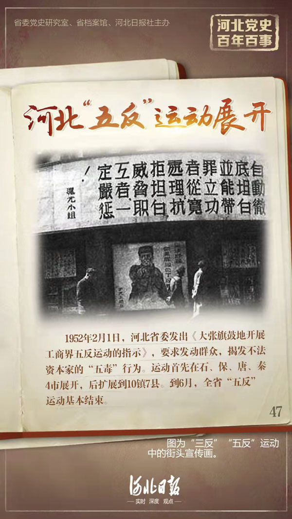 由于“三反”運動中揭露出一些不法資本家行賄、偷漏稅、盜竊國家財產(chǎn)、偷工減料、盜竊國家經(jīng)濟情報等犯罪現(xiàn)象,中共中央在1952年1月發(fā)出在大中城市向違法資本家開展大規(guī)模的“反行賄、反偷稅漏稅、反盜竊國家財產(chǎn)、反偷工減料、反盜竊國家經(jīng)濟情報”斗爭的指示。2月1日,河北省委發(fā)出《大張旗鼓地開展工商界五反運動的指示》,要求發(fā)動群眾,揭發(fā)不法資本家的“五毒”行為。運動首先在石、保、唐、秦4市展開,后擴展到10鎮(zhèn)7縣。據(jù)對4個市調(diào)查,有15%的工商戶半違法和嚴重違法。經(jīng)過普遍發(fā)動、限期交代、結(jié)合檢舉、重點清查幾個階段,到6月,全省“五反”運動基本結(jié)束。