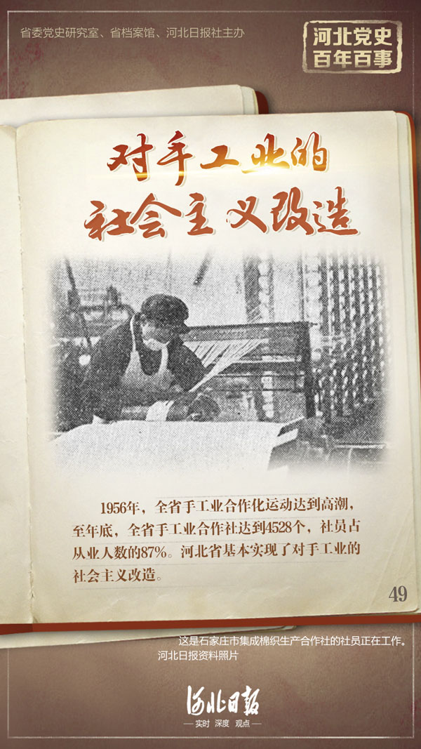 河北歷史上是個(gè)手工業(yè)比較發(fā)達(dá)的省。據(jù)1949年底統(tǒng)計(jì),全省有32.4萬(wàn)人從事各類(lèi)手工業(yè)。但由于生產(chǎn)分散、設(shè)備簡(jiǎn)陋,資金不足,所以生產(chǎn)效率很低。從1949年開(kāi)始,河北省開(kāi)始試辦手工業(yè)合作社,從貸款、供銷(xiāo)、稅收等各方面重點(diǎn)扶持,起到了很好的示范帶動(dòng)作用。1951年8月,全省手工業(yè)生產(chǎn)合作會(huì)議召開(kāi),對(duì)試辦的合作社進(jìn)行整頓和扶持。到1952年底,全省手工業(yè)合作社達(dá)到288個(gè)。1953年,在中央過(guò)渡時(shí)期總路線指引下,合作社進(jìn)入穩(wěn)定發(fā)展期。1954年1月,河北省委召開(kāi)全省手工業(yè)工作會(huì)議,提出“積極領(lǐng)導(dǎo),穩(wěn)步前進(jìn)”和“集資入股,自備工具,分工合作,按勞分配”的方針,推動(dòng)了合作社的迅速發(fā)展。到年底,全省合作社發(fā)展到2896個(gè)。1955年12月,全省手工業(yè)合作社第一屆社員代表大會(huì)召開(kāi),從組織上、思想上為實(shí)現(xiàn)全省手工業(yè)合作化打下基礎(chǔ),使1956年全省手工業(yè)合作化運(yùn)動(dòng)達(dá)到高潮。至年底,全省手工業(yè)合作社達(dá)到4528個(gè),社員占從業(yè)人數(shù)的87%。河北省基本實(shí)現(xiàn)了對(duì)手工業(yè)的社會(huì)主義改造。