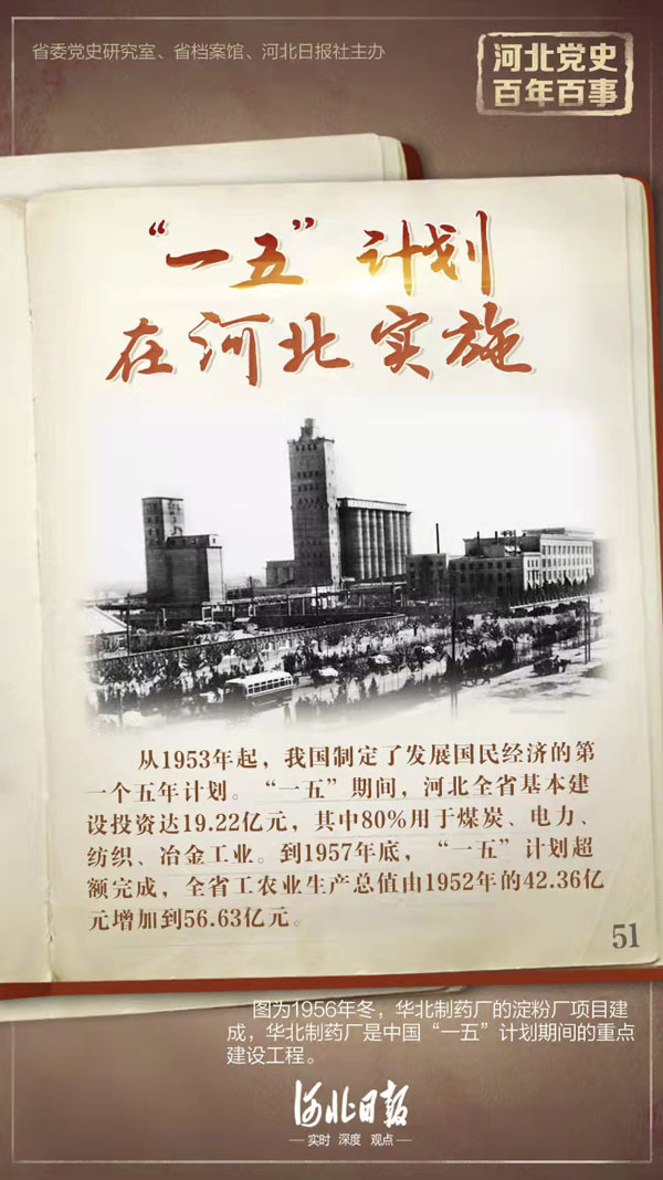 從1953年起,我國制定了發(fā)展國民經(jīng)濟的第一個五年計劃,即“一五”計劃。河北省結(jié)合自己的實際制定了“一五”計劃的基本任務:集中力量發(fā)展重工業(yè),有重點地進行基本建設,改善農(nóng)業(yè)生產(chǎn)條件,發(fā)展貿(mào)易、交通、文衛(wèi)事業(yè),積極進行農(nóng)業(yè)、手工業(yè)、工商業(yè)的社會主義改造。“一五”期間,全省基本建設投資達到19.22億元,其中80%用于煤炭、電力、紡織、冶金工業(yè)。煤炭業(yè)投資3.37億元,電力投資2.28億元,紡織業(yè)投資2.834億元。1954年10月,國家156個重點建設項目之一的石家莊熱電廠一期工程開工興建。1955年,蘇聯(lián)援建的全國最大的化學藥品工廠——華北制藥廠也開始興建。同時興建的還有保定造紙廠、保定膠片廠等,許多大型的水利工程也開工建設。在全省人民共同努力下,到1957年底,“一五”計劃超額完成,全省工農(nóng)業(yè)生產(chǎn)總值由1952年的42.36億元增加到56.63億元。