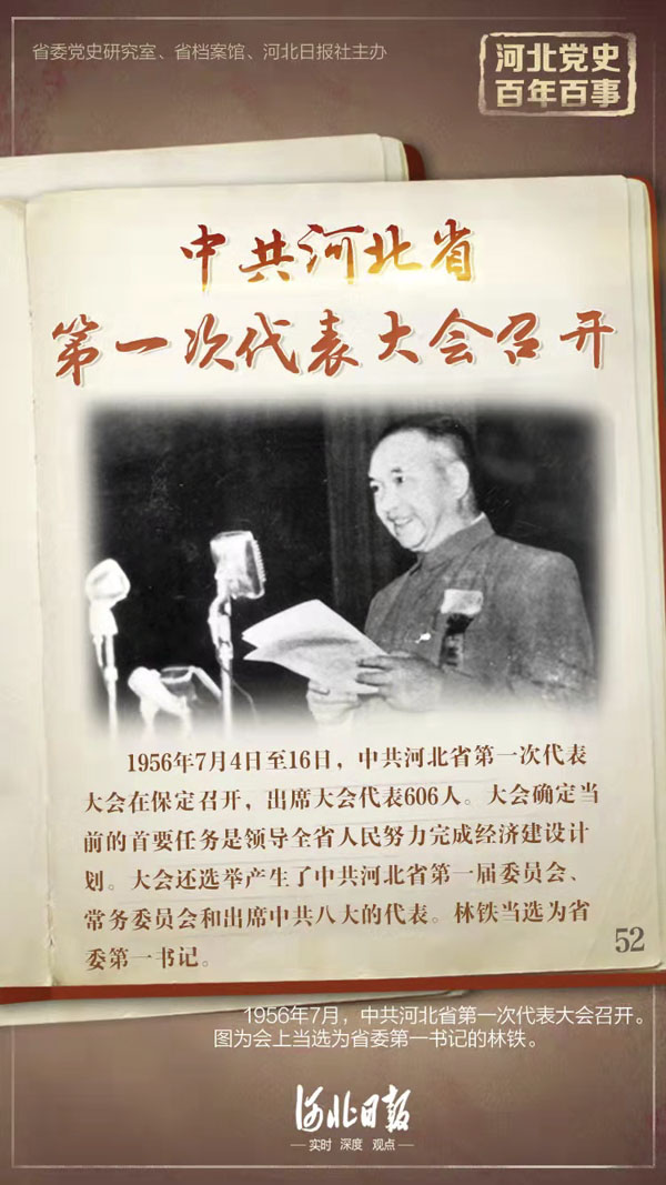 河北的社會主義改造基本完成之后,為總結(jié)經(jīng)驗(yàn),研究新形勢下的新任務(wù),1956年7月4日至16日,中共河北省第一次代表大會在保定召開,出席大會代表606人,省委書記林鐵作了《建省以來的工作情況與今后任務(wù)》的報(bào)告,大會審議并通過了副書記閻達(dá)開作的《河北省委關(guān)于貫徹執(zhí)行〈1956年到1967年全國農(nóng)業(yè)發(fā)展綱要(草案)〉的規(guī)劃(草案)》。大會確定當(dāng)前的首要任務(wù)是領(lǐng)導(dǎo)全省人民努力完成經(jīng)濟(jì)建設(shè)計(jì)劃,要求各級黨委要加強(qiáng)對工農(nóng)業(yè)生產(chǎn)的領(lǐng)導(dǎo),同時(shí)做好商業(yè)、財(cái)政、金融、文教、衛(wèi)生工作,加強(qiáng)黨的建設(shè),反對官僚主義和主觀主義。大會還選舉產(chǎn)生了中共河北省第一屆委員會、常務(wù)委員會和出席中共八大的代表。林鐵當(dāng)選為省委第一書記,馬國瑞、閻達(dá)開、張承先、谷云亭為省委書記處書記。這次大會為加強(qiáng)黨的建設(shè)和全面社會主義建設(shè)做了思想和組織上的準(zhǔn)備。