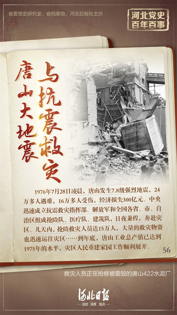 1976年7月28日凌晨3時42分,唐山發(fā)生7.8級強烈地震,造成24萬多人遇難,16萬多人受傷,經(jīng)濟損失300億元。地震發(fā)生后,重病中的毛澤東得知消息后第一時間作出指示,委托中央其他領導同志組織抗震救災工作,要求迅速派慰問團去唐山,慰問災區(qū)人民,安置好災民生活。中央成立抗震救災指揮部,決定由河北省委、省軍區(qū)和北京軍區(qū)成立河北省唐山抗震救災前線指揮部和后勤指揮部,省委第一書記劉子厚等到現(xiàn)場領導抗震救災工作。解放軍和全國各省、市、自治區(qū)組成搶險隊、醫(yī)療隊、建筑隊日夜兼程,奔赴災區(qū)。幾天之內(nèi),搶險救災人員達到15萬人。同時,大量的救災物資也迅速運往災區(qū)。