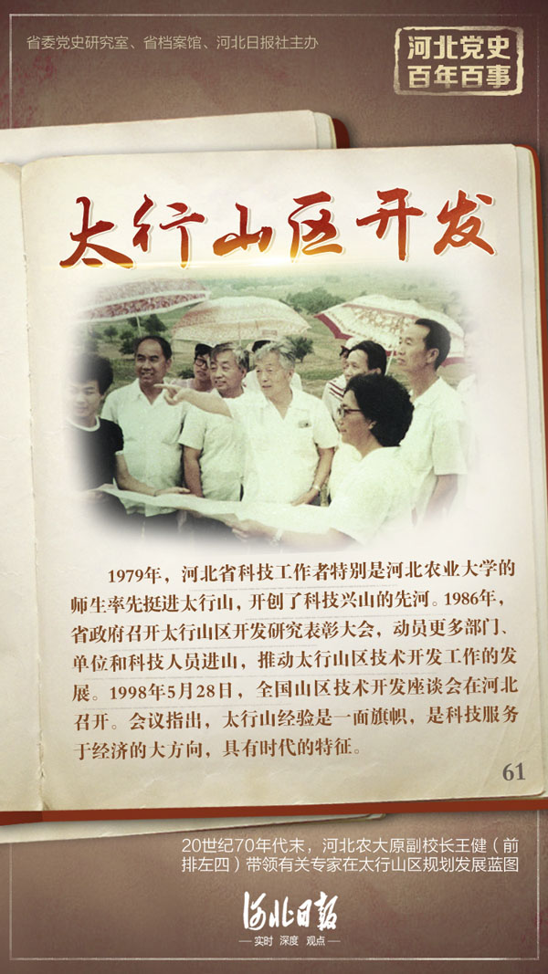 1979年,河北省科技工作者特別是河北農(nóng)業(yè)大學(xué)的師生率先挺進太行山,開創(chuàng)了科技興山的先河。1986年3月2日,省政府召開太行山區(qū)開發(fā)研究表彰大會,進一步動員更多的部門、單位和科技人員進山,推動太行山區(qū)技術(shù)開發(fā)工作的發(fā)展,加快山區(qū)脫貧致富和經(jīng)濟振興。為此,國務(wù)院和國家科委分別發(fā)來賀電、賀信。4月12日,省委、省政府作出《關(guān)于推廣河北農(nóng)業(yè)大學(xué)實行教學(xué)、科研、生產(chǎn)三結(jié)合,綜合治理太行山區(qū)經(jīng)驗的決定》,要求在進一步發(fā)展平原經(jīng)濟的同時,把綜合開發(fā)山區(qū)、濱海、壩上作為重點,促進河北經(jīng)濟、文化全面振興。1996年,我省召開山區(qū)經(jīng)濟開發(fā)會議推進山區(qū)開發(fā),加速扶貧攻堅進程。1998年5月28日,全國山區(qū)技術(shù)開發(fā)座談會在河北召開。會議指出,太行山經(jīng)驗是一面旗幟,是科技服務(wù)于經(jīng)濟的大方向,具有時代的特征。