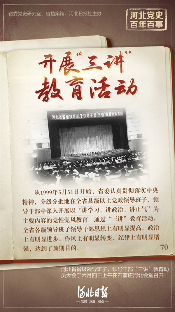 從1999年5月31日開始,省委認(rèn)真貫徹落實(shí)中央精神,分級(jí)分批地在全省縣級(jí)以上黨政領(lǐng)導(dǎo)班子、領(lǐng)導(dǎo)干部中深入開展以“講學(xué)習(xí)、講政治、講正氣”為主要內(nèi)容的黨性黨風(fēng)教育。省級(jí)“三講”教育從1999年5月31日開始至8月27日結(jié)束;市廳級(jí)“三講”教育從1999年8月27日開始至2000年2月28日結(jié)束;縣(市、區(qū))“三講”教育從2000年2月28日開始至2001年1月3日結(jié)束。通過“三講”教育活動(dòng),全省各級(jí)領(lǐng)導(dǎo)班子領(lǐng)導(dǎo)干部思想上有明顯提高、政治上有明顯進(jìn)步、作風(fēng)上有明顯轉(zhuǎn)變、紀(jì)律上有明顯增強(qiáng),達(dá)到了預(yù)期目的。