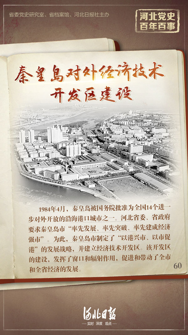 1984年4月,秦皇島被國務(wù)院批準(zhǔn)為全國14個進(jìn)一步對外開放的沿海港口城市之一。河北省委、省政府要求秦皇島市“率先發(fā)展、率先突破、率先建成經(jīng)濟(jì)強(qiáng)市”。為此,秦皇島市制定了“以港興市、以市促港”的發(fā)展戰(zhàn)略,并建立經(jīng)濟(jì)技術(shù)開發(fā)區(qū)。該開發(fā)區(qū)的建設(shè),發(fā)揮了窗口和輻射作用,促進(jìn)和帶動了全市和全省經(jīng)濟(jì)的發(fā)展。1986年7月31日,省政府召開加快秦皇島經(jīng)濟(jì)技術(shù)開發(fā)區(qū)建設(shè)研討會。1988年3月18日,國務(wù)院批準(zhǔn)秦-唐-滄渤海灣為對外經(jīng)濟(jì)開放區(qū)。兩年之后,河北省召開了對外開放工作會議,第一次正式提出全省對外開放。全省對外開放的步伐由此加快。