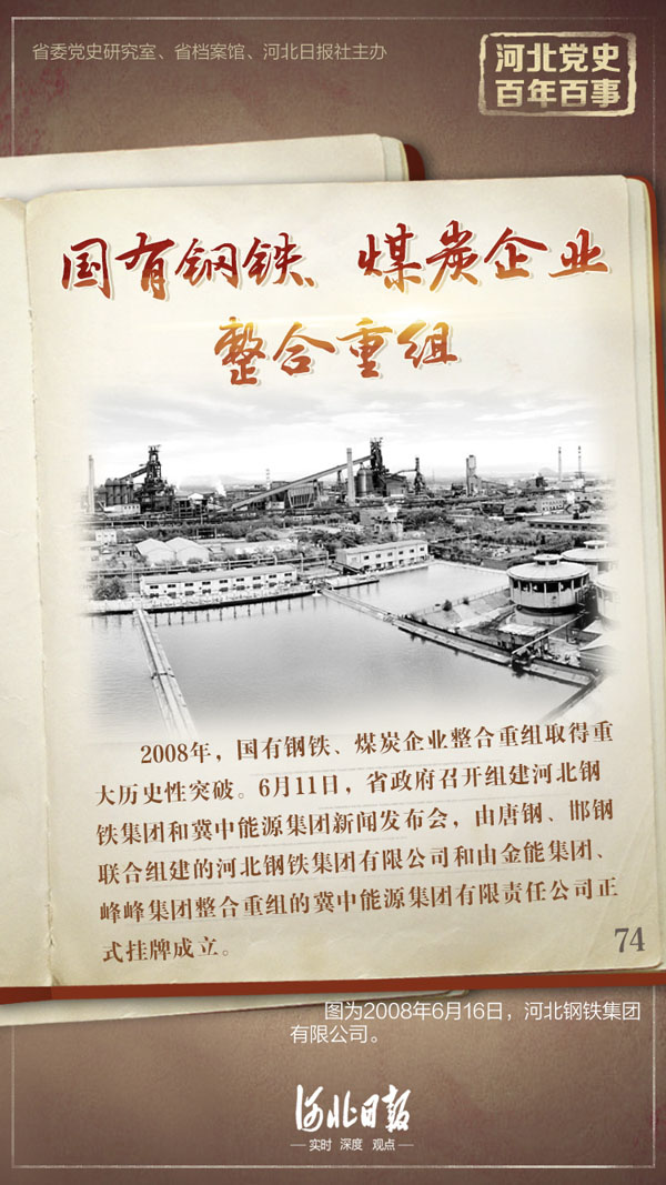 2008年,國(guó)有鋼鐵、煤炭企業(yè)整合重組取得重大歷史性突破。6月11日,省政府召開(kāi)組建河北鋼鐵集團(tuán)(唐鋼集團(tuán)、邯鋼集團(tuán))和冀中能源集團(tuán)(峰峰集團(tuán)、金能集團(tuán))新聞發(fā)布會(huì),由唐鋼、邯鋼聯(lián)合組建的河北鋼鐵集團(tuán)有限公司和由金能集團(tuán)、峰峰集團(tuán)整合重組的冀中能源集團(tuán)有限責(zé)任公司正式掛牌成立。組建河北鋼鐵、冀中能源兩大集團(tuán)公司是省委、省政府從全省經(jīng)濟(jì)社會(huì)發(fā)展實(shí)際出發(fā),順應(yīng)國(guó)內(nèi)外產(chǎn)業(yè)發(fā)展趨勢(shì),貫徹落實(shí)國(guó)家產(chǎn)業(yè)政策,提高產(chǎn)業(yè)集中度和綜合競(jìng)爭(zhēng)力,推動(dòng)鋼鐵、煤炭產(chǎn)業(yè)優(yōu)化升級(jí)的重大戰(zhàn)略決策。