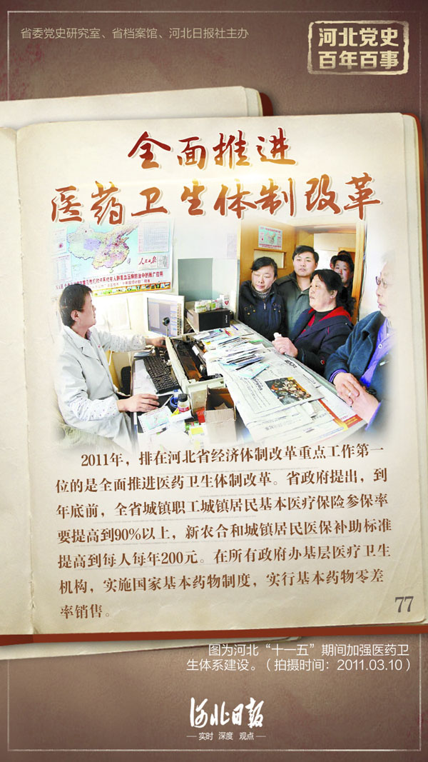 2011年,排在河北省經(jīng)濟體制改革重點工作第一位的是全面推進醫(yī)藥衛(wèi)生體制改革。河北省政府提出,到年底前,全省城鎮(zhèn)職工城鎮(zhèn)居民基本醫(yī)療保險參保率要提高到90%以上,新農(nóng)合和城鎮(zhèn)居民醫(yī)保補助標(biāo)準提高到每人每年200元。在所有政府辦基層醫(yī)療衛(wèi)生機構(gòu),實施國家基本藥物制度,實行基本藥物零差率銷售。同步推進基層醫(yī)藥衛(wèi)生體制綜合改革。3月25日,全省深化醫(yī)藥衛(wèi)生體制改革會議提出,要深化醫(yī)藥衛(wèi)生體制改革,切實把基本醫(yī)療衛(wèi)生制度作為公共產(chǎn)品向全民提供,增強基層醫(yī)療衛(wèi)生機構(gòu)的服務(wù)能力,使更多的居民不出社區(qū)、不出鄉(xiāng)村就能看常見病、多發(fā)病,加快建立覆蓋全省的醫(yī)療保障體制機制,為保基本、強基層提供長效保障。當(dāng)年,河北省政府先后出臺《關(guān)于全面推進醫(yī)藥衛(wèi)生體制改革的意見》等15個文件,制定了多項配套措施,著力推動重點改革。