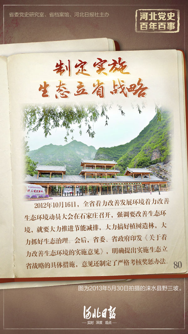 2012年10月16日,全省著力改善發(fā)展環(huán)境著力改善生態(tài)環(huán)境動(dòng)員大會(huì)在石家莊召開(kāi),強(qiáng)調(diào)要改善生態(tài)環(huán)境,就要大力推進(jìn)節(jié)能減排,大力搞好植樹(shù)造林,大力抓好生態(tài)治理。要加快構(gòu)建綠色低碳產(chǎn)業(yè)體系,積極推進(jìn)綠色生態(tài)建設(shè),加快環(huán)境污染綜合整治,創(chuàng)新環(huán)境保護(hù)體制機(jī)制,全面推進(jìn)生態(tài)文明建設(shè)。會(huì)后,河北省委、省政府印發(fā)《關(guān)于著力改善生態(tài)環(huán)境的實(shí)施意見(jiàn)》,明確提出實(shí)施生態(tài)立省戰(zhàn)略的具體措施,并提出了四大目標(biāo)、五大任務(wù)、六大工程。意見(jiàn)還制定了嚴(yán)格考核獎(jiǎng)懲辦法。2016年2月19日,河北省印發(fā)《河北省生態(tài)環(huán)境保護(hù)責(zé)任追究暫行辦法》,對(duì)在落實(shí)生態(tài)環(huán)境保護(hù)責(zé)任過(guò)程中不履職、不當(dāng)履職、違法履職、未盡責(zé)履職導(dǎo)致產(chǎn)生嚴(yán)重后果和惡劣影響的責(zé)任人依法依規(guī)進(jìn)行責(zé)任追究。