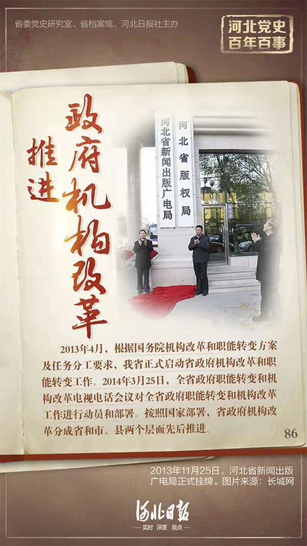 2013年4月,根據(jù)國(guó)務(wù)院機(jī)構(gòu)改革和職能轉(zhuǎn)變方案及任務(wù)分工要求,河北省正式啟動(dòng)省政府機(jī)構(gòu)改革和職能轉(zhuǎn)變工作。《河北省人民政府機(jī)構(gòu)改革方案》明確22項(xiàng)重點(diǎn)任務(wù),其中對(duì)應(yīng)國(guó)務(wù)院機(jī)構(gòu)改革6項(xiàng),結(jié)合河北實(shí)際16項(xiàng)。重新組建省食品藥品監(jiān)督管理局。組建省衛(wèi)生和計(jì)劃生育委員會(huì);組建省新聞出版廣電局;調(diào)整省能源局職責(zé);加強(qiáng)環(huán)境工作和執(zhí)法力量;優(yōu)化政府機(jī)構(gòu)設(shè)置;改革省直機(jī)關(guān)管理企業(yè)體制。加快政府職能轉(zhuǎn)變是此次政府機(jī)構(gòu)改革的核心和重點(diǎn)。省政府制定出臺(tái)《河北省政府職能轉(zhuǎn)變工作方案任務(wù)分工》,明確減少和下放投資審批事項(xiàng)、減少和下放生產(chǎn)經(jīng)營(yíng)活動(dòng)審批事項(xiàng)等10類、共50項(xiàng)具體任務(wù),其中對(duì)應(yīng)國(guó)務(wù)院任務(wù)分工42項(xiàng),結(jié)合河北實(shí)際增加8項(xiàng),并分別明確38個(gè)牽頭和協(xié)辦部門,提出目標(biāo)任務(wù)、完成時(shí)限等具體要求。2014年3月25日,全省政府職能轉(zhuǎn)變和機(jī)構(gòu)改革電視電話會(huì)議對(duì)全省政府職能轉(zhuǎn)變和機(jī)構(gòu)改革工作進(jìn)行動(dòng)員和部署。按照國(guó)家部署,省政府機(jī)構(gòu)改革分成省和市、縣兩個(gè)層面先后推進(jìn)。