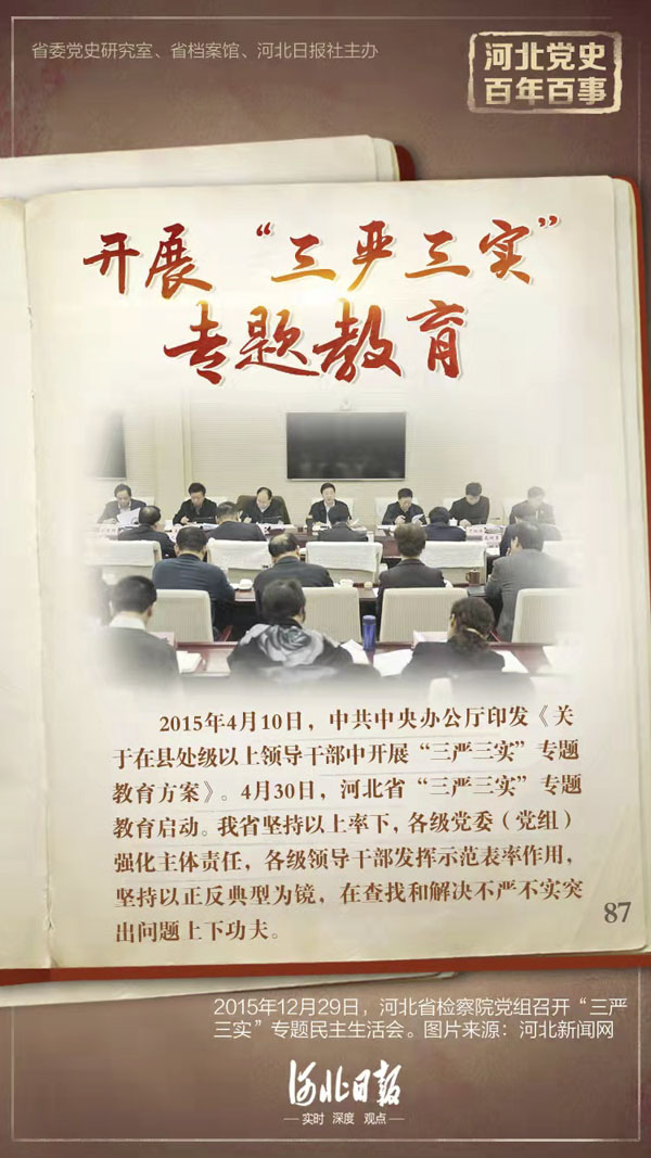 2015年4月10日,中共中央辦公廳印發(fā)《關(guān)于在縣處級以上領(lǐng)導干部中開展“三嚴三實”專題教育方案》。4月30日,河北省“三嚴三實”專題教育啟動。同日,省委“三嚴三實”專題教育聯(lián)系會議第一次會議召開。河北省堅持以上率下,各級黨委(黨組)強化主體責任,各級領(lǐng)導干部發(fā)揮示范表率作用,堅持以正反典型為鏡,在查找和解決不嚴不實突出問題上下功夫。各級各部門充分運用“兩種教材”“兩面鏡子”,教育黨員領(lǐng)導干部從先進典型中獲取精神力量,從反面典型中總結(jié)深刻教訓,結(jié)合召開專題民主生活會和組織生活會,嚴肅認真開展批評與自我批評,深入查找和整改不嚴不實問題。這次專題教育突出問題導向,對縣處級以上領(lǐng)導干部在思想、作風、黨性上進行又一次集中“補鈣”和“加油”,推動了領(lǐng)導干部踐行“三嚴三實”常態(tài)化、長效化。