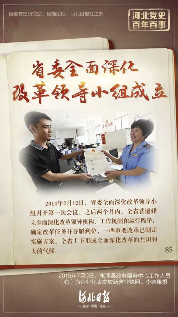 2014年2月12日,省委全面深化改革領(lǐng)導(dǎo)小組召開第一次會議,審議省委全面深化改革領(lǐng)導(dǎo)小組下設(shè)經(jīng)濟(jì)體制和生態(tài)文明體制改革、民主法治領(lǐng)域改革、文化體制改革、社會體制改革、黨的建設(shè)制度改革和基層基礎(chǔ)工作改革、紀(jì)律檢查體制改革、農(nóng)業(yè)和農(nóng)村體制改革等7個(gè)專項(xiàng)小組人員名單;審議《省委全面深化改革領(lǐng)導(dǎo)小組工作規(guī)劃》《省委全面深化改革領(lǐng)導(dǎo)小組專項(xiàng)小組工作規(guī)則》《省委全面深化改革領(lǐng)導(dǎo)小組辦公室工作細(xì)則》以及《〈中共河北省委關(guān)于學(xué)習(xí)貫徹黨的十八屆三中全會精神的決議〉重要舉措分工方案》《河北省2014年全面深化改革重要舉措分工方案》。之后兩個(gè)月內(nèi),全省普遍建立全面深化改革領(lǐng)導(dǎo)機(jī)構(gòu)、工作機(jī)制和運(yùn)行程序,確定改革任務(wù)并分解到位,一些重要改革已制定實(shí)施方案。全省上下形成全面深化改革的共識和大的氣候。
