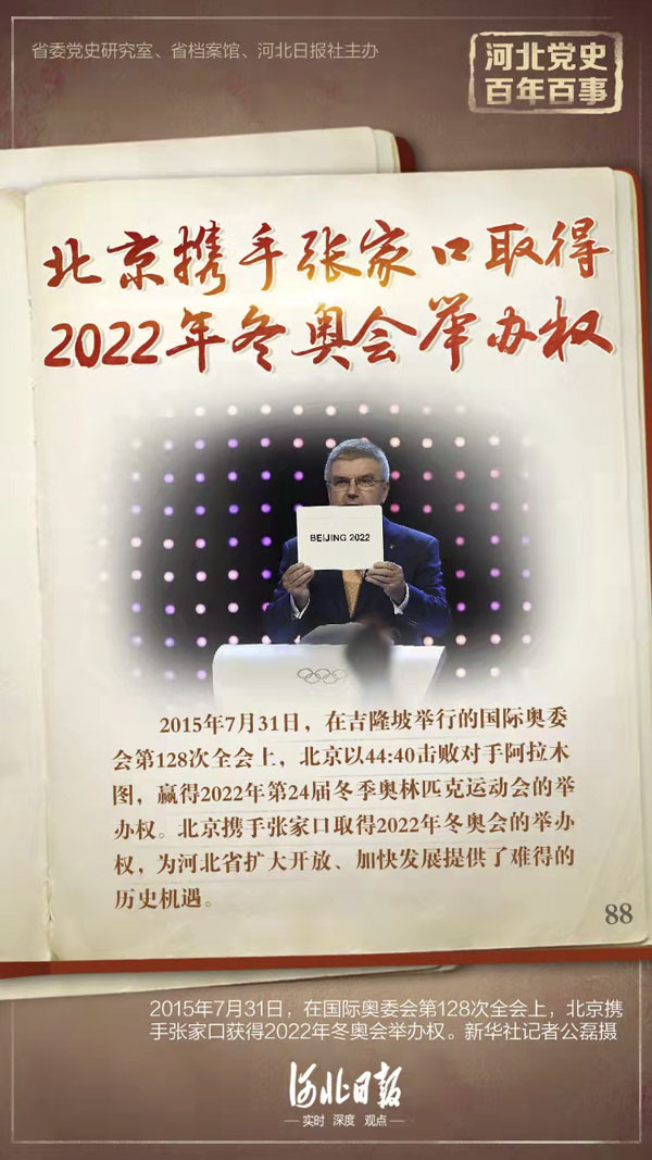 2013年11月3日,中國(guó)奧委會(huì)正式致函國(guó)際奧委會(huì),提名北京市、河北省張家口市聯(lián)合申辦2022年冬奧會(huì)。2015年7月31日,在吉隆坡舉行的國(guó)際奧委會(huì)第128次全會(huì)上,北京以44∶40擊敗對(duì)手阿拉木圖,贏得2022年第24屆冬季奧林匹克運(yùn)動(dòng)會(huì)的舉辦權(quán)。北京攜手張家口取得2022年冬奧會(huì)的舉辦權(quán),為河北省擴(kuò)大開放、加快發(fā)展提供了難得的歷史機(jī)遇,是繼京津冀協(xié)同發(fā)展重大國(guó)家戰(zhàn)略實(shí)施后,河北迎來(lái)的又一個(gè)重大發(fā)展機(jī)遇,對(duì)于推動(dòng)經(jīng)濟(jì)社會(huì)發(fā)展,全方位融入京津冀協(xié)同發(fā)展戰(zhàn)略格局具有十分重要的意義。