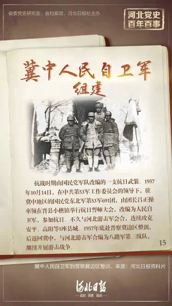 抗日戰(zhàn)爭時(shí)期由國民黨東北軍第53軍691團(tuán)改編的一支抗日武裝。1937年10月14日,在中共第53軍工作委員會(huì)的領(lǐng)導(dǎo)下,駐冀中地區(qū)的國民黨東北軍第53軍691團(tuán),由團(tuán)長呂正操率領(lǐng)在晉縣小樵鎮(zhèn)舉行抗日誓師大會(huì),改編為人民自衛(wèi)軍,參加抗日。不久與河北游擊軍會(huì)合,連續(xù)攻克安平、高陽等5座縣城,收編部分民團(tuán)武裝,消滅部分漢奸土匪武裝,部隊(duì)得到擴(kuò)大。1937年底赴晉察冀邊區(qū)整訓(xùn),1938年1月返回冀中,繼續(xù)開展游擊戰(zhàn)爭,襲擊日軍,破壞交通。同年4月,與河北游擊軍合編為八路軍第三縱隊(duì)。