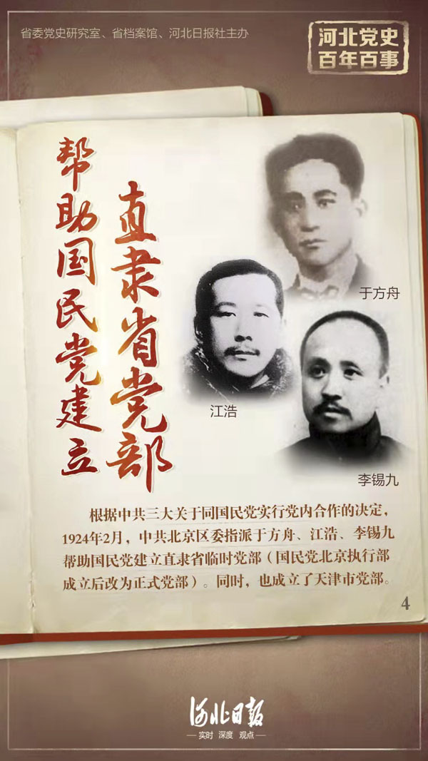根據(jù)中共三大關于同國民黨實行黨內合作的決定,1924年2月,中共北京區(qū)委指派于方舟、江浩、李錫九幫助國民黨建立直隸省臨時黨部(國民黨北京執(zhí)行部成立后改為正式黨部)。同時,也成立了天津市黨部。