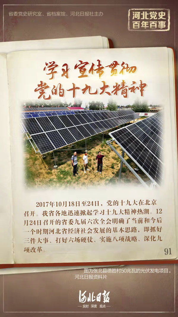 2017年10月18日至24日,黨的十九大在北京召開。河北省各地迅速掀起學(xué)習(xí)十九大精神熱潮。10月26日,省委召開常委會(擴(kuò)大)會議和全省領(lǐng)導(dǎo)干部大會,傳達(dá)學(xué)習(xí)貫徹黨的十九大和十九屆一中全會精神。11月1日,省委發(fā)出通知,要求各地各部門深入學(xué)習(xí)宣傳貫徹黨的十九大精神,把全省黨員干部群眾的思想統(tǒng)一到黨的十九大精神上來,把力量凝聚到實現(xiàn)黨的十九大確定的各項任務(wù)上來。11月2日,省委九屆五次全會在石家莊召開,審議通過《中共河北省委關(guān)于深入學(xué)習(xí)宣傳貫徹黨的十九大精神奮力開創(chuàng)新時代建設(shè)經(jīng)濟(jì)強(qiáng)省美麗河北新局面的決定》。為深入學(xué)習(xí)貫徹黨的十九大精神,推動思想大解放,在解放思想中加快創(chuàng)新發(fā)展、綠色發(fā)展、高質(zhì)量發(fā)展,12月24日召開的省委九屆六次全會明確了當(dāng)前和今后一個時期河北省經(jīng)濟(jì)社會發(fā)展的基本思路,即抓好三件大事、打好六場硬仗、實施八項戰(zhàn)略、深化九項改革。