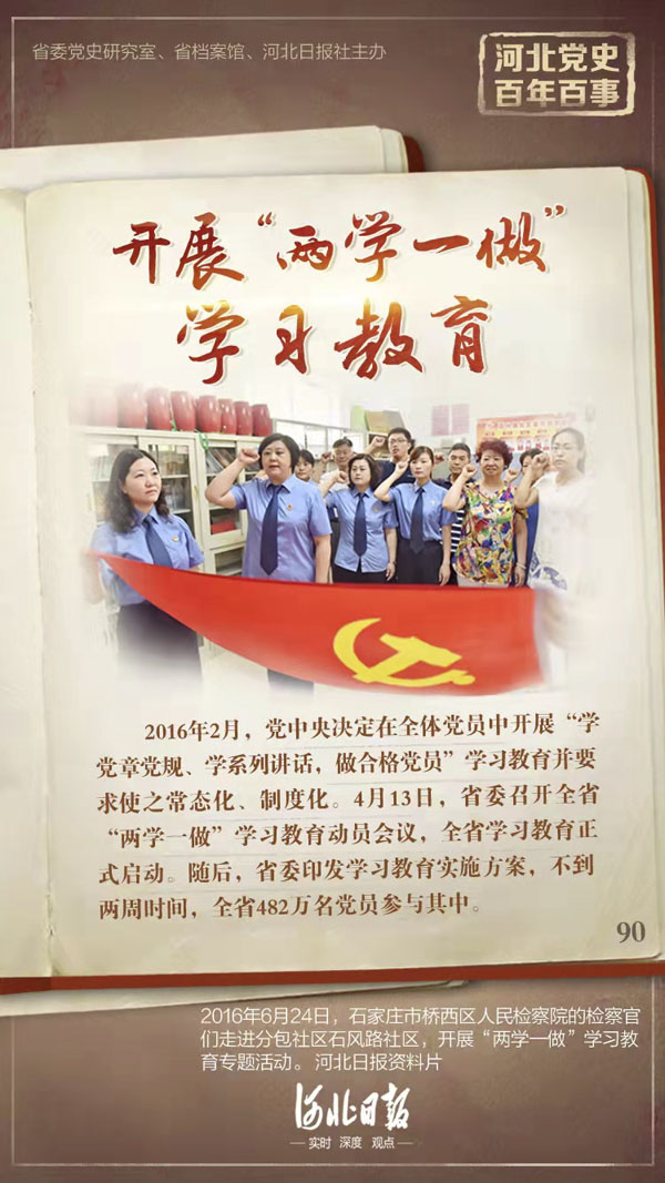 2016年2月,黨中央決定在全體黨員中開展“學黨章黨規(guī)、學系列講話,做合格黨員”學習教育并要求使之常態(tài)化、制度化。4月13日,省委召開全省“兩學一做”學習教育動員會議,全省學習教育正式啟動。隨后,省委印發(fā)學習教育實施方案,不到兩周時間,全省11個設(shè)區(qū)市、169個縣(市、區(qū))、6個省級黨工委和180多家省直部門和中直駐冀單位、省屬院校、省管企業(yè)全部完成動員部署,覆蓋全省18.2萬個基層黨組織,482萬名黨員參與其中。全省各級黨組織以這次學習教育為契機,結(jié)合年內(nèi)開展的省級機關(guān)作風整頓、“一問責八清理”、解放思想大討論等,著力解決突出問題,持續(xù)整頓軟弱渙散黨組織,培訓基層黨組織書記和黨務(wù)骨干,完善黨員日常教育管理措施,基層黨組織和黨員隊伍建設(shè)取得新進展。