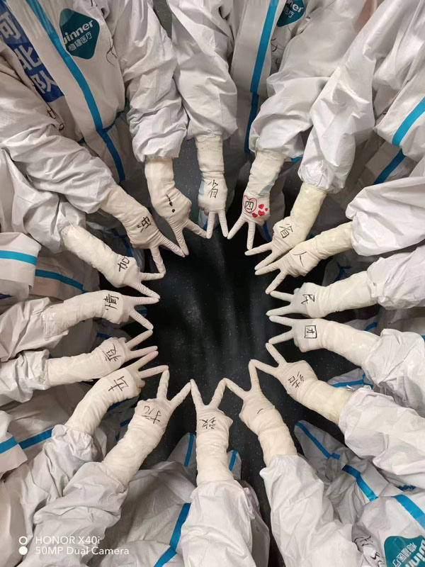 我院負(fù)責(zé)方艙內(nèi)最大的區(qū)域X區(qū),累及共收治患者2000多人次。感染者人數(shù)多,病情復(fù)雜,其中有懷孕5個(gè)多月先兆流產(chǎn)的孕婦,有幾個(gè)月襁褓中的嬰兒,有五六歲懵懂單純的孩童,有八十多歲高齡的老人,有需要緊急搶救的重癥病人……。每一天,醫(yī)療隊(duì)員都穿著厚厚的防護(hù)服,守護(hù)著數(shù)百名患者,持續(xù)高負(fù)荷工作。在密不透風(fēng)的包裹下,轉(zhuǎn)身、低頭這樣的常規(guī)動(dòng)作都顯得尤為艱難;每個(gè)班次下來(lái),護(hù)目鏡布滿了水霧,防護(hù)服里的洗手衣已經(jīng)濕透。脫下防護(hù)服后,手上腳上都是紅色的濕疹,癢到鉆心……呼市的夜晚最低氣溫到了零下8-10度,大家凍得瑟瑟發(fā)抖,但依然笑稱自己是寒夜中貓頭鷹一樣的守護(hù)者。