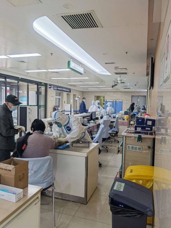 當(dāng)面對患者激增、人員不足、感染風(fēng)險增大等難題時,東院區(qū)急診科同樣開啟了“吃住在科里,只有上班沒有下班的24小時工作模式”。全員加班加點,黨員發(fā)揮先鋒模范作用,不斷改造布局、優(yōu)化工作流程、完善院感管理。為了降低院內(nèi)感染風(fēng)險,緊急改造搶救、急診門診隔離緩沖間,嚴格實行“一患一消”“一患一陪”制度,查驗核酸結(jié)果,堅持救治與防控兩手抓。