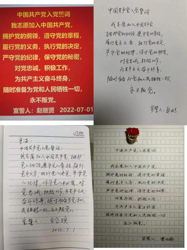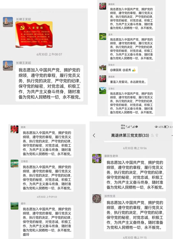 7月1日,離退休黨總支下屬各黨支部,在微信群分別開(kāi)展了“重溫入黨誓詞 回顧黨的故事”主題黨日活動(dòng)。大家通過(guò)手機(jī)、電腦面對(duì)黨旗,以宣讀和書寫的方式重溫了入黨誓詞。離退休第二黨支部書記劉鹿寧同志,以《黨和我家》為題講述了父親在抗日戰(zhàn)爭(zhēng)爆發(fā)后,毅然投筆從戎的故事。大家表示,要不斷學(xué)習(xí)前輩們愛(ài)國(guó)愛(ài)黨的精神,聽(tīng)黨話,跟黨走,為了黨的事業(yè)忠心耿耿,用實(shí)際行動(dòng)捍衛(wèi)來(lái)之不易的幸福生活,迎接黨的二十大勝利召開(kāi)。