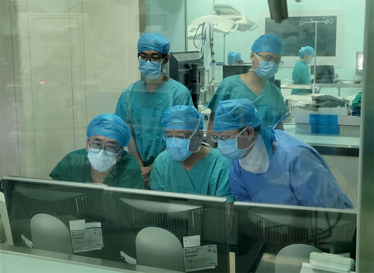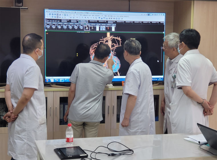 由于病情復(fù)雜,完善術(shù)前準(zhǔn)備后,外三科李勇教授、范立僑教授組織本科聯(lián)合心臟血管外科、泌尿外科、放射介入科、CT磁共振科、麻醉科及手術(shù)室醫(yī)務(wù)人員共同研究治療策略。大家圍繞如何減少術(shù)中大出血、減少手術(shù)并發(fā)癥、提高手術(shù)成功率等眾多難題進(jìn)行重點討論,最終決定啟用DSA復(fù)合手術(shù)室,以便于外科手術(shù)與介入手術(shù)實現(xiàn)“一站式服務(wù)”,術(shù)前由介入科醫(yī)師行腫瘤供血血管栓塞術(shù),之后外三科醫(yī)師行手術(shù)切除,并根據(jù)術(shù)中可能出現(xiàn)的不同情況制定了詳細(xì)的手術(shù)預(yù)案。同時,在血源極為緊張的條件下,輸血科趙學(xué)濤主任醫(yī)師積極協(xié)調(diào),保證供血,為手術(shù)的成功啟動提供了先決條件。