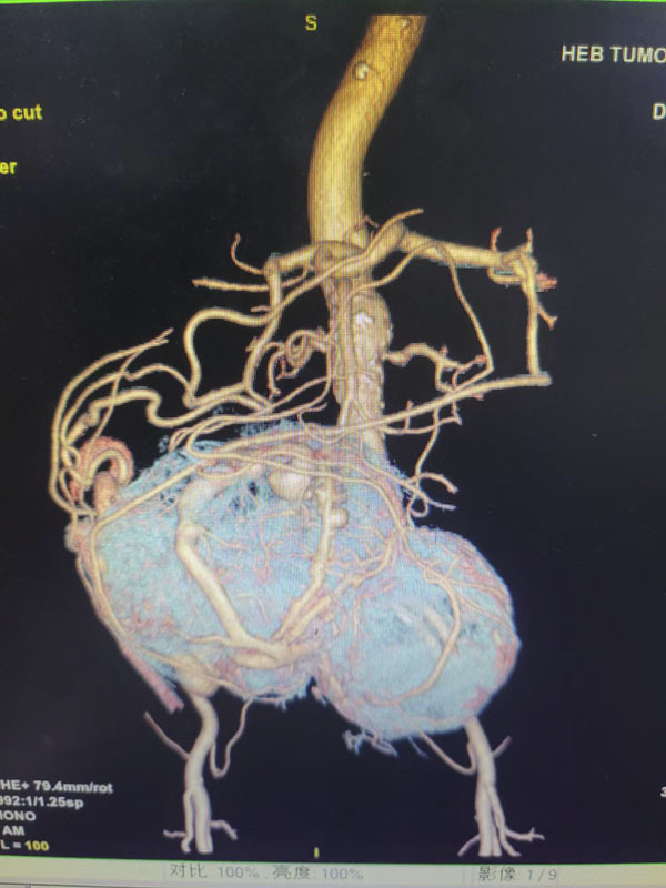 患者為一名72歲女性,今年4月體檢時發(fā)現(xiàn)腹盆腔存在巨大腫瘤,且膀胱、直腸出現(xiàn)壓迫癥狀,在外地診治無果后前往我院外三科就診,由李勇教授收治入院。經(jīng)檢查發(fā)現(xiàn),患者中下腹可觸一質(zhì)硬、邊界不清、不活動的腫物,病理結(jié)果考慮孤立性纖維瘤。CT影像顯示,腫物長徑約20cm,與腸系膜血管、髂血管、右側(cè)輸尿管、膀胱、子宮等組織器官關(guān)系緊密,同時CT血管三維重建顯示腫瘤表面布滿迂曲粗大的血管,腫瘤血供極為豐富,手術(shù)難度和風(fēng)險極大。