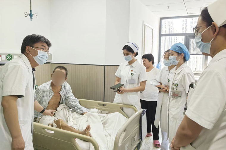 多日后,患者轉(zhuǎn)入骨科接受相關(guān)治療,以更好控制右下肢感染。荀建軍主任、趙飛飛主治醫(yī)師及骨科團(tuán)隊(duì)根據(jù)實(shí)際情況,請(qǐng)內(nèi)分泌科置入胰島素泵,嚴(yán)密科學(xué)控制血糖;針對(duì)患者心率快、咳嗽、喘憋等癥狀,請(qǐng)相關(guān)科室會(huì)診,調(diào)整心肺功能,預(yù)防肺部感染。患者還存在胃部不適、尿頻、尿急等情況,骨科分別請(qǐng)消化內(nèi)科、泌尿外科、營養(yǎng)科等會(huì)診,整體提升各器官功能,減少并發(fā)癥,促進(jìn)病人康復(fù)。在治療期間,患者出現(xiàn)情感淡漠、焦慮等表現(xiàn),荀建軍主任敏銳察覺到病人存在大創(chuàng)傷后心因性抑郁和隱匿性抑郁,他指導(dǎo)患者口服抗抑郁藥,調(diào)動(dòng)醫(yī)護(hù)人員開展情緒疏導(dǎo)等,有效平復(fù)了患者的消極情緒。在大家的共同努力下,病人的飲食、睡眠等情況明顯好轉(zhuǎn)。