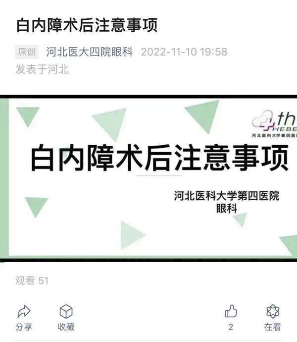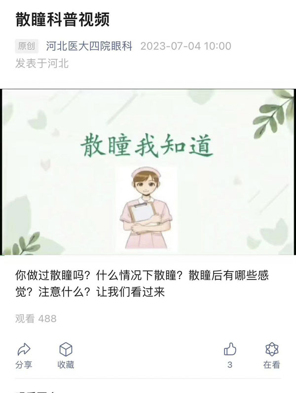 此外,團(tuán)隊(duì)制作了正確滴眼藥水、預(yù)防跌倒、糖尿病視網(wǎng)膜病變、白內(nèi)障、散瞳、斜視、近視、黃斑變性、視網(wǎng)膜脫離、青光眼等一系列科普視頻,書寫了多篇眼科常見疾病術(shù)后宣教、出院指導(dǎo)等科普文章,并有相應(yīng)的宣教二維碼、眼科公眾號(hào)及視頻號(hào)。