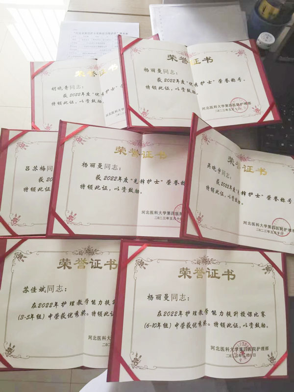 團(tuán)隊(duì)注重能力提升,積極參與各級(jí)競(jìng)賽。2021年5月,呂蘇梅副護(hù)士長(zhǎng)參加河北醫(yī)科大學(xué)青年教師英語授課競(jìng)賽,獲二等獎(jiǎng);2022年10月,楊麗曼、蘇佳斌參加院內(nèi)2022年青年教師授課競(jìng)賽,在五官科選拔賽中,分別獲得中流砥柱組和青春活力組第一名;2023年9月,吳曉宇和張曉翠獲河北省護(hù)理學(xué)會(huì)組織的外科護(hù)理科普競(jìng)賽優(yōu)秀獎(jiǎng);10月,楊麗曼和白金莎在河北省護(hù)理學(xué)會(huì)組織的眼科護(hù)理科普競(jìng)賽演講中獲二等獎(jiǎng)。此外,呂蘇梅參與河北醫(yī)科大學(xué)本科《老年護(hù)理學(xué)》和《護(hù)理研究》課程教學(xué),胡曉青參與河北醫(yī)科大學(xué)本科眼科臨床帶教學(xué)。