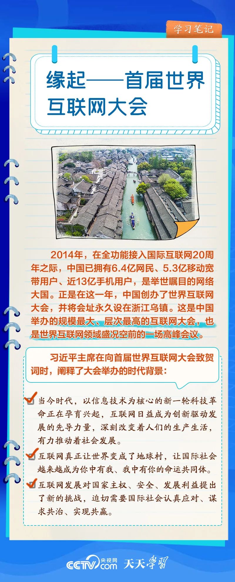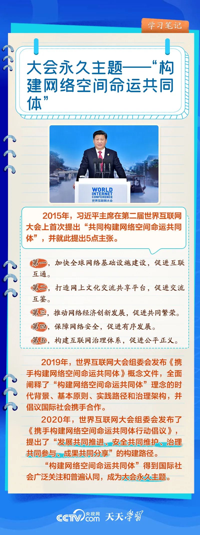 前九屆世界互聯(lián)網(wǎng)大會(huì),習(xí)近平主席或親臨現(xiàn)場(chǎng)發(fā)表主旨演講,或視頻致辭,或向大會(huì)發(fā)來(lái)賀信,以不同形式關(guān)心大會(huì)舉辦。央視網(wǎng)《天天學(xué)習(xí)》欄目推出學(xué)習(xí)筆記,與您一起了解世界互聯(lián)網(wǎng)大會(huì)的十年“網(wǎng)”事。